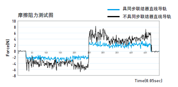 傳統(tǒng)不具同步聯(lián)結(jié)器之直線導(dǎo)軌開始運行時,負(fù)荷側(cè)的鋼珠會先運動,再推擠方向回轉(zhuǎn)部與無負(fù)荷側(cè)內(nèi)的鋼珠,造成連鎖的來回碰撞,使得摩擦阻力變動起伏劇烈。而采用SynchMotionTM技術(shù)的QH系列直線導(dǎo)軌由于具有同步聯(lián)結(jié)器,將同一循環(huán)內(nèi)的所有鋼珠串聯(lián)在一起,所以當(dāng)滑塊開始運動時,所有鋼珠幾乎同時啟動,且鋼珠間并無來回的碰撞,在保持一定的運動慣性下,摩擦阻力的變動幅度能有效的減少。