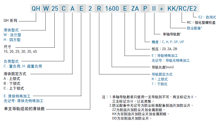 (2)    注: 1.單軸導軌數若只使用一支導軌則不寫,兩支標記為Ⅱ,