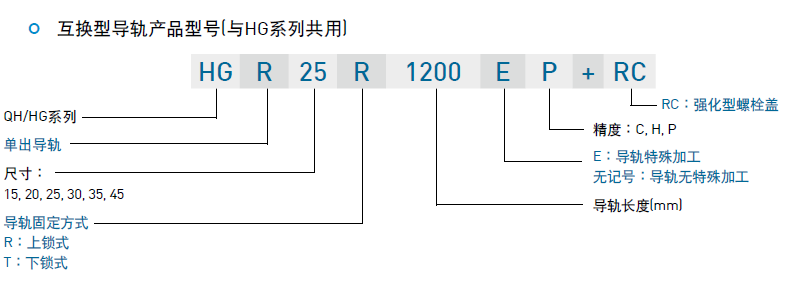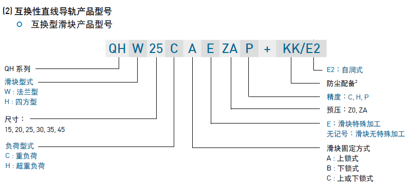 QH系列分為非互換性及互換性兩種直線導軌,兩者規格尺寸相同,主要差異點在于互換性型之滑塊、導軌可單出互換使用,較便利,但其組合精度無法達到非互換型所擁有的超高精度等級。不過由于HIWIN在制造上有良好的尺寸控制及嚴格的質量要求,互換性型之組合精度已達到一定的水平,對不需配對安裝直線導軌的客戶而言,是一項很好的選擇。