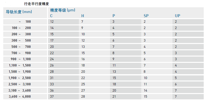 HDS2滾輪導(dǎo)軌分為兩種精度等級:普通級C(commercial)和精密級P(precision), 精度指標如下:
