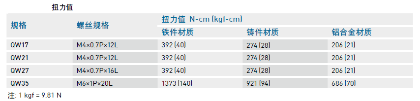 直線導(dǎo)軌精度甚劇,因此為達到每顆螺絲都能鎖緊的目的,建議使用下列扭力值鎖裝配螺絲。